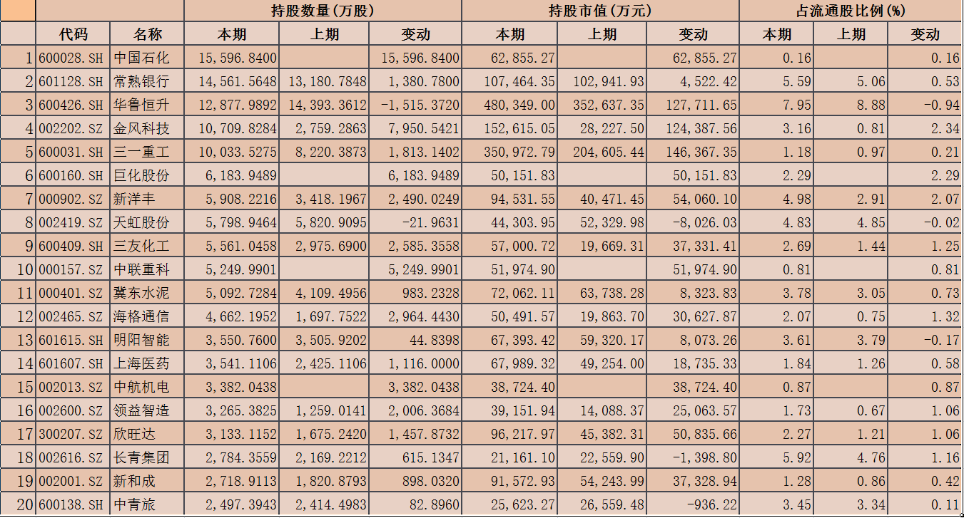 從持股數(shù)量來看,截至2020年四季度末,上述87家公司中,中國石化、常熟銀行、華魯恒升、金風(fēng)科技和三一重工等5家公司社?;鸪止蓴?shù)量居前,均在1億股以上。