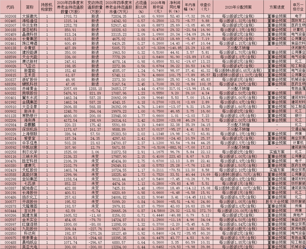 新進(jìn)個(gè)股方面,截至去年四季度末,養(yǎng)老金新進(jìn)持有16只個(gè)股,大族激光、海格通信、華蘭生物等3只個(gè)股在此期間養(yǎng)老金新進(jìn)持股數(shù)量均超1000萬股,分別為1703.73萬股、1315.14萬股、1252.78萬股,美亞柏科、晶澳科技、長青集團(tuán)、珠江啤酒等4只個(gè)股本期養(yǎng)老金新進(jìn)持股數(shù)量也均逾500萬股。另外,中青旅、建投能源、天合光能、康達(dá)新材、飛亞達(dá)、新雷能、玉禾田、浙礦股份、鍵凱科技等9只個(gè)股本期也獲養(yǎng)老金的青睞。