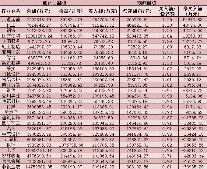 六、截至4月12日申萬(wàn)級(jí)一級(jí)行業(yè)兩融交易情況