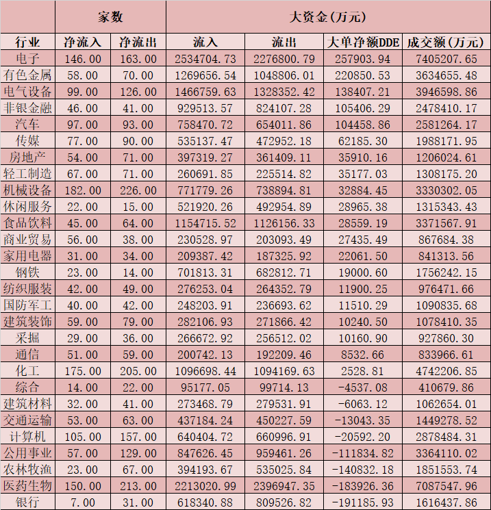二、周三(4月14日)申萬一級行業(yè)大單資金流向