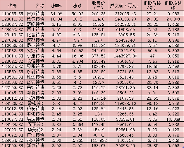 記者進(jìn)一步統(tǒng)計(jì)發(fā)現(xiàn),上述26只漲幅超2%的可轉(zhuǎn)債中,德爾轉(zhuǎn)債、洪城轉(zhuǎn)債、伊力轉(zhuǎn)債等3只今日正股價(jià)格均實(shí)現(xiàn)漲停,火炬轉(zhuǎn)債(8.80%)、小康轉(zhuǎn)債(8.05%)、昌紅轉(zhuǎn)債(7.89%)、貝斯轉(zhuǎn)債(7.49%)、百川轉(zhuǎn)債(7.18%)、新泉轉(zhuǎn)債(5.66%)、盛屯轉(zhuǎn)債(5.58%)和比音轉(zhuǎn)債(5.21%)等8只正股價(jià)格漲幅也均在5%以上。