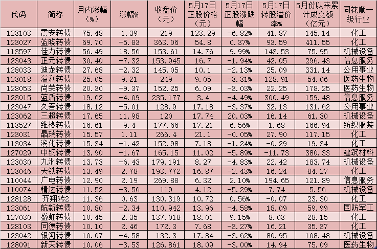 表:5月份以來累計(jì)漲幅超10%的可轉(zhuǎn)債一覽