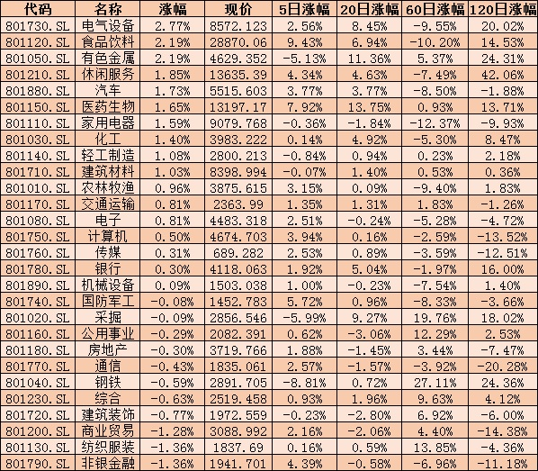 從申萬一級28個(gè)行業(yè)來看,周一,電氣設(shè)備、有色金屬和食品飲料等三行業(yè)漲幅居前均超2%,分別為2.77%、2.19%和2.19%。而紡織服裝、非銀金融和商業(yè)貿(mào)易跌幅均超1%。