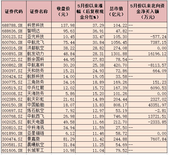 個(gè)股方面,5月份以來,截至5月27日收盤,板塊內(nèi)有83只個(gè)股期間實(shí)現(xiàn)上漲,占比超九成,其中,科思科技、智明達(dá)、亞光科技、中航沈飛等4只個(gè)股期間累計(jì)漲幅居前,分別上漲37.29%、36.91%、33.47%、30.84%,洪都航空、航發(fā)動(dòng)力、新余國科、中航高科、天和防務(wù)等5只個(gè)股期間累計(jì)漲幅也均超20%。