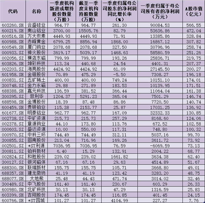 表:一季度包括社保、券商、險資、QFII等機構新進增持的有色金屬股一覽:
