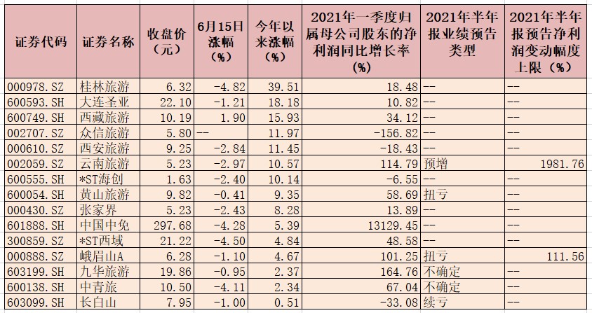 與此同時,旅游板塊公司的業(yè)績也在恢復(fù)向好,同花順數(shù)據(jù)顯示,有19家景點及旅游公司今年一季度歸屬母公司股東的凈利潤實現(xiàn)同比增長,占比超七成,其中,中國中免、宋城演藝、九華旅游、云南旅游、峨眉山A等5家公司今年一季度歸屬母公司股東的凈利潤同比增長率均超100%。此外,截至6月15日收盤,有9家景點及旅游公司發(fā)布了今年上半年業(yè)績預(yù)告,有3家公司業(yè)績預(yù)喜,其中,云南旅游業(yè)績預(yù)增,峨眉山A和黃山旅游預(yù)計扭虧。