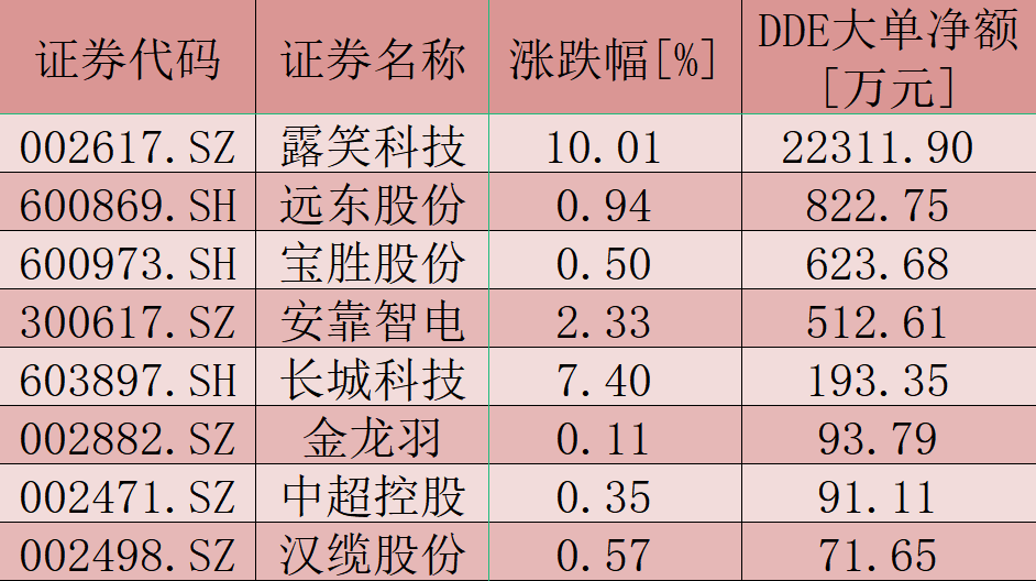 電線電纜板塊的行情也與資金面因素相關。同花順數據顯示,大單資金正積極搶籌部分電線電纜板塊個股。今日,共有8只個股獲2.47億元大單資金搶籌,露笑科技獲大單資金凈流入額最多,高達2.23億元;遠東股份、寶勝股份和安靠智電的大單資金凈流入額也達到500萬元以上,分別為822.75萬元、623.68萬元和512.61萬元。