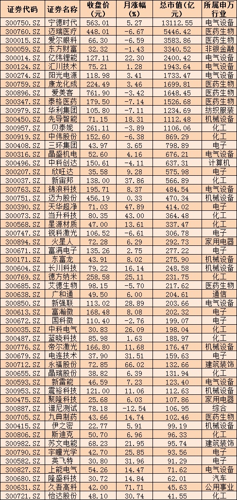 記者統(tǒng)計發(fā)現(xiàn),7月份以來截至周二收盤,有55家創(chuàng)業(yè)板上市公司的股價,創(chuàng)出了歷史新高。其中,寧德時代、邁瑞醫(yī)療、愛爾眼科、東方財富、億緯鋰能、匯川技術、陽光電源、康龍化成、愛美客、泰格醫(yī)藥、華利集團、先導智能、貝泰妮等13只創(chuàng)業(yè)板公司的總市值均在千億元以上。