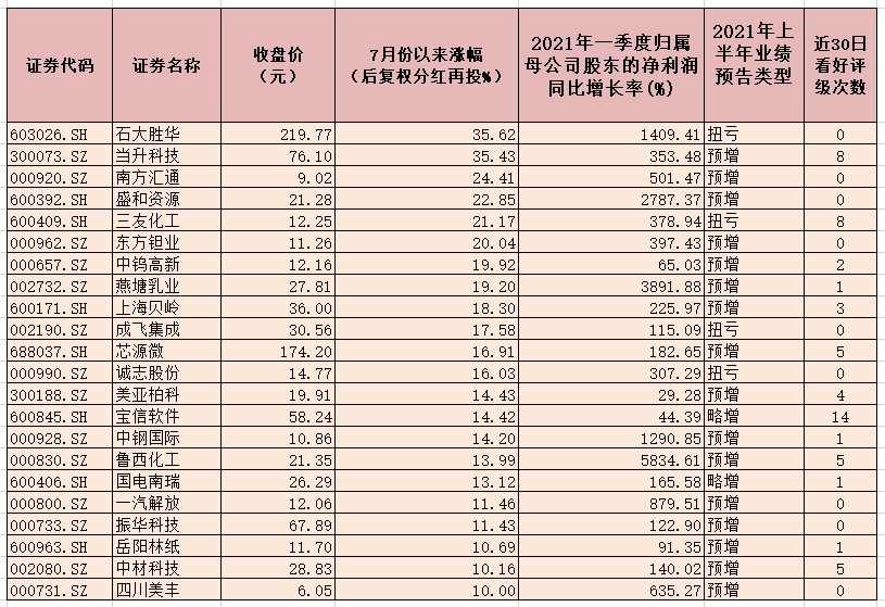 7月份以來,上述業(yè)績預(yù)喜的公司也呈現(xiàn)了不錯(cuò)的市場表現(xiàn),有73只個(gè)股期間跑贏上證指數(shù)(期間累計(jì)下跌1.75%),占比超七成,其中,石大勝華、當(dāng)升科技、南方匯通、盛和資源、三友化工、東方鉭業(yè)等6只個(gè)股期間累計(jì)漲幅均超20%,盡顯強(qiáng)勢。