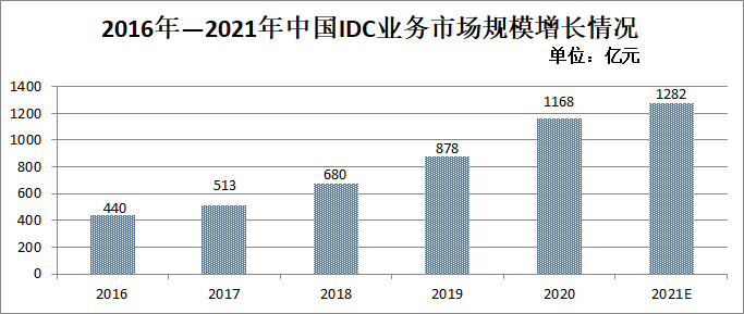 受新基建、網(wǎng)絡(luò)強(qiáng)國、數(shù)字經(jīng)濟(jì)等國家政策影響以及新一代信息技術(shù)發(fā)展的驅(qū)動(dòng),我國互聯(lián)網(wǎng)數(shù)據(jù)中心(IDC)業(yè)務(wù)市場規(guī)模保持高速增長。據(jù)信通院數(shù)據(jù)顯示,2016年,我國IDC業(yè)務(wù)市場規(guī)模為440億元,到2020年我國IDC業(yè)務(wù)市場規(guī)模達(dá)到1168億元,五年復(fù)合增長率約33.09%。機(jī)構(gòu)預(yù)測未來仍將保持快速增長,預(yù)計(jì)2021年IDC業(yè)務(wù)市場規(guī)??蛇_(dá)1282億元。據(jù)中國IDC此前發(fā)布的報(bào)告預(yù)計(jì),2022年,中國IDC業(yè)務(wù)市場規(guī)模將超過3200.5億元,同比增長28.8%。