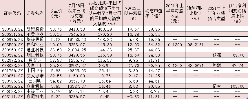 表:7月28日以來(lái)日均成交額實(shí)現(xiàn)增長(zhǎng)的運(yùn)輸設(shè)備股一覽