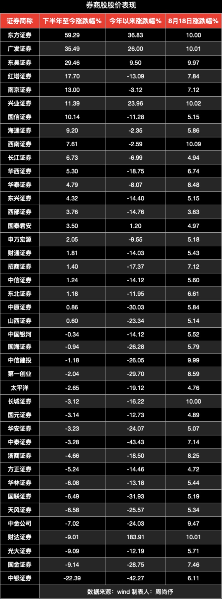 8月18日,沉寂已久的券商股迎來大漲,41只個股平均漲幅高達(dá)6.84%,日成交額為731.09億元表現(xiàn)亮眼。其中,西南證券、興業(yè)證券、廣發(fā)證券、東方證券等8只券商股漲停,還有27只券商股漲幅均超5%。