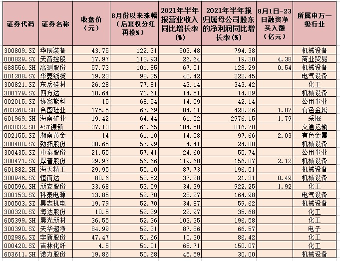 表:8月份以來(lái)漲幅超50%的上半年?duì)I收和凈利雙增長(zhǎng)股一覽