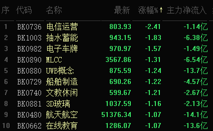 此外,電信運營、抽水蓄能、電子車牌等10類板塊跌幅均超1%。