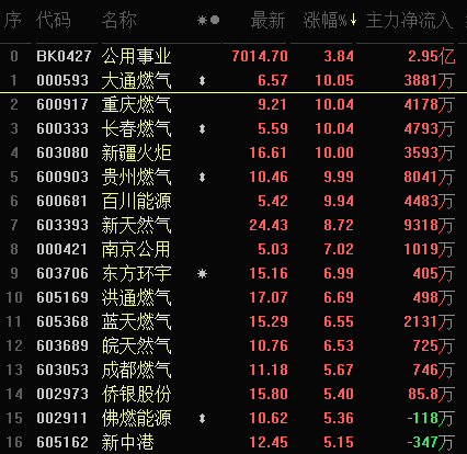 排名第二位的是公用事業(yè),板塊上漲3.84%,大單資金凈流入達6.44億元,大通燃氣、重慶燃氣、長春燃氣等6只個股漲停。