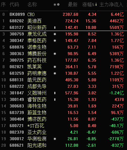 從盤面來看,CRO概念板塊指數(shù)飆升4.34%,排名第一,板塊大單資金凈流入達6.44億元,昭衍新藥漲停,板塊漲幅第一的美迪西登上龍虎榜。