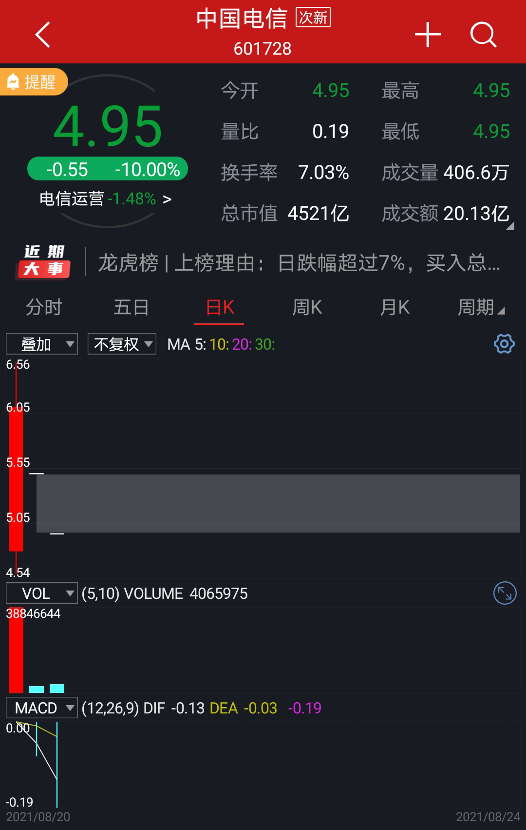 中國電信在上市第一天大漲35%,在隨后2天則連續(xù)跌停。兩日跌停下,中國電信市值蒸發(fā)1059.41億元。截至收盤,報4.95元/股,跌停板上783萬手封單封死跌停。目前中國電信總市值4521億元。