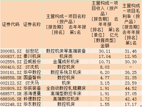 通過表格可以發(fā)現(xiàn),去年主營構成第一位是機床類項目的12家公司,項目收入均超1.55億元,其中,創(chuàng)世紀數(shù)控機床等高端裝備收入30.11億元,毛利率31.46%。此外,秦川機床和亞威股份的這一項目收入也超過10億元。