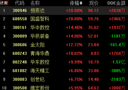 從熱點板塊來看,漲幅榜前10位的板塊近5日漲幅有5個超過10%,顯示A股部分板塊持續(xù)性較好。工業(yè)母機再次登上同花順指數(shù)漲幅榜首,不過,板塊DDE資金卻出現(xiàn)1.04億元的凈流出,有包括國盛智科、恒而達在內的5只個股漲停。