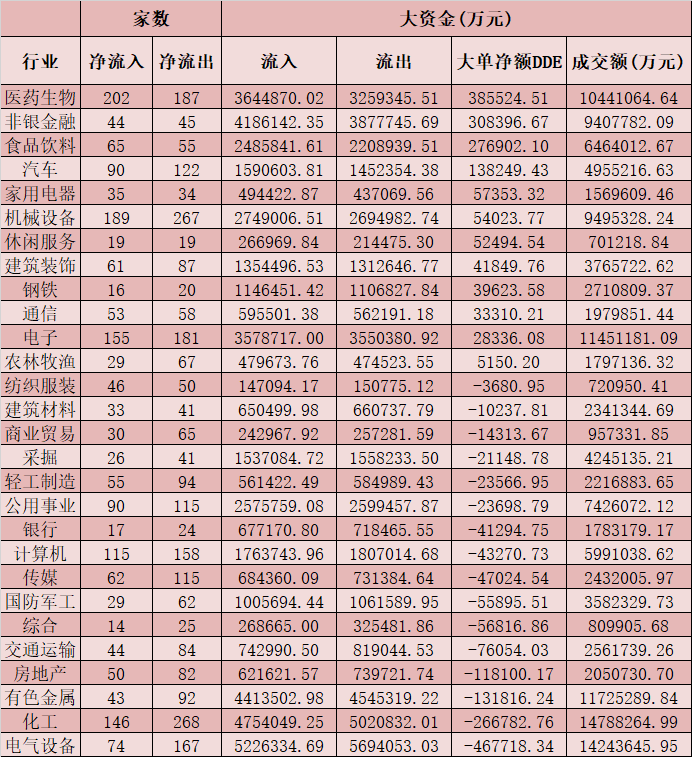 資金流向方面,時隔9個交易日后A股再次出現(xiàn)大單資金凈流入態(tài)勢,周一,A股市場大單資金凈流入2億元。從申萬一級的28個行業(yè)來看,有12個行業(yè)呈現(xiàn)資金凈流入態(tài)勢,醫(yī)藥生物、非銀金融、食品飲料和汽車等行業(yè)大單資金凈流入均在10億元以上。另外,16個行業(yè)均呈現(xiàn)大單資金凈流出態(tài)勢,其中,電氣設備、化工、有色金屬、房地產(chǎn)等行業(yè),大單資金凈流出均超10億元。