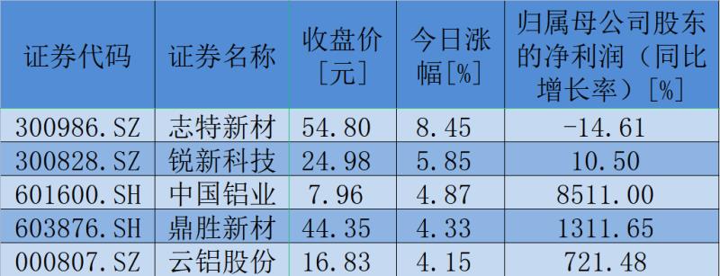 表:9月6日,申萬鋁板塊股價(jià)漲幅超4%個(gè)股一覽