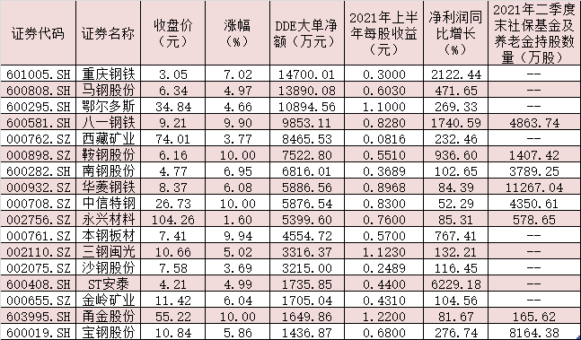 在行業(yè)基本面持續(xù)改善的背景下,社?;鸺梆B(yǎng)老金也提前布局部分鋼鐵股。統(tǒng)計(jì)顯示,截至今年二季度末,有11只鋼鐵股獲社?;鸺梆B(yǎng)老金持倉(cāng),華菱鋼鐵、首鋼股份、鞍鋼股份、甬金股份等4只個(gè)股本期獲社保基金及養(yǎng)老金新進(jìn)持有,持股數(shù)量分別為11267.04萬(wàn)股、2480.05萬(wàn)股、1407.42萬(wàn)股和165.62萬(wàn)股,八一鋼鐵、永興材料、中信特鋼等3只個(gè)股本期也被社保基金及養(yǎng)老金增持,增持?jǐn)?shù)量分別為3153.74萬(wàn)股、360.98萬(wàn)股和61.00萬(wàn)股。