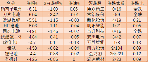 今天新能源電池概念遭遇逆風(fēng),各大概念均出現(xiàn)下跌,前十位下跌的板塊中占比超八成。以鈉離子電池居首下跌6.31%,隨著的是刀片電池(-6.04%)、鹽湖提鋰(-5.51%)、HIT電池(-5.03%)、固態(tài)電池(-4.91%)等,跌幅均在4%以上。多只千億市值的鋰礦股跌停,光伏和儲(chǔ)能板塊也被帶崩了。