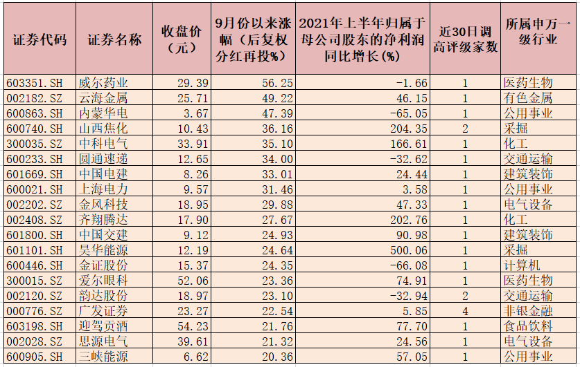 從市場表現(xiàn)來看,9月份以來,上述207只獲得調(diào)高評級的個股中有112只個股實(shí)現(xiàn)上漲,占比超五成,其中,威爾藥業(yè)、云海金屬、內(nèi)蒙華電、山西焦化、中科電氣、圓通速遞、中國電建、上海電力等8只個股期間累計漲幅均超30%,表現(xiàn)強(qiáng)勢。
