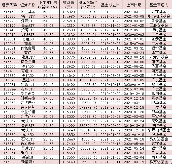 同花順數(shù)據(jù)統(tǒng)計發(fā)現(xiàn),截至9月23日收盤,在562只ETF基金中,有212只ETF基金下半年以來取得正收益,其中,有34只ETF基金下半年以來收益率均超20%,稀土基金(516150)、稀土ETF(516780)、煤炭ETF(515220)等3只ETF基金期間收益率均在50%以上,分別為58.30%、57.85%、54.19%,商品ETF(510170)(49.03%)、資源ETF(510410)(43.20%)、鋼鐵ETF(515210)(42.89%)、有色60(159881)(40.63%)、能源(159945)(40.28%)和有色金屬(159871)(40.07%)等6只ETF基金期間均獲40%以上的收益率,絕大部分是周期類ETF基金。
