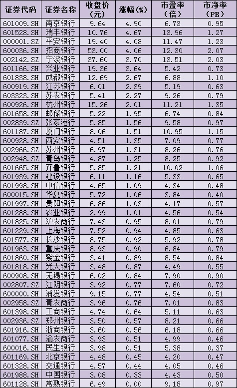 中泰證券則表示,政策托底,市場風格偏防御,推動銀行股上行。建議兩條主線選股。一是,持續(xù)擁抱銀行核心資產(chǎn):招商銀行、寧波銀行、平安銀行。二是,選擇低估值、資產(chǎn)質(zhì)量安全、有望轉(zhuǎn)型成功的銀行,看好郵儲銀行、江蘇銀行、南京銀行和興業(yè)銀行。