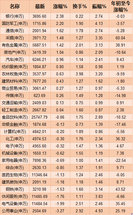 具體板塊方面,銀行和國防軍工表現(xiàn)強勢;公用事業(yè)、電氣設備和休閑服務走低。