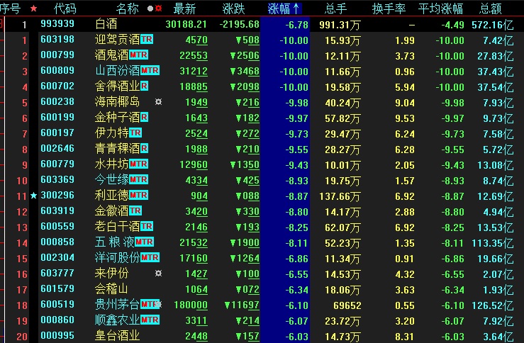 周一,與大幅飆升的煤炭股相比,“白酒股大跌”的消息不斷被刷屏,并登上熱搜。截至收盤,白酒板塊全線重挫,跌幅達6.78%。海南椰島、迎駕貢酒、山西汾酒、酒鬼酒等均以跌停價報收,五糧液跌逾8%,貴州茅臺也以6.1%的跌幅收盤。據(jù)測算,周一,整個白酒板塊市值蒸發(fā)逾3000億元。