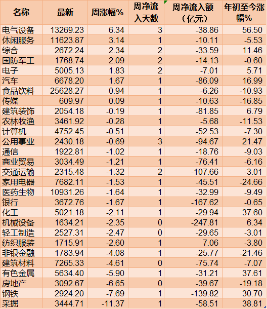 從申萬一級(jí)行業(yè)來看,本周逾8類申萬一級(jí)行業(yè)實(shí)現(xiàn)上漲,其中,電氣設(shè)備(6.34%)、休閑服務(wù)(3.14%)、綜合(2.34%)、國(guó)防軍工(2.09%)等4類行業(yè)指數(shù)周漲幅均超2%。此外,采掘(-11.37%)、鋼鐵(-7.69%)、房地產(chǎn)(-6.65%)、有色金屬(-5.90%)等4類行業(yè)指數(shù)周跌幅均超5%。
