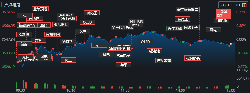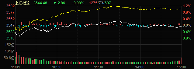 11月1日,A股三大指數(shù)盤中分化,收盤漲跌不一,截至收盤,上證指數(shù)跌0.08%,深證成指漲0.17%,創(chuàng)業(yè)板指跌0.56%;滬深兩市合計成交額12231.59億元,兩市成交額連續(xù)第7個交易日突破1萬億元;總體來看,兩市個股漲多跌少,上漲股達(dá)3111只。