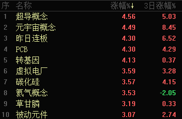 概念板塊方面,超導(dǎo)、元宇宙等板塊上漲,漲幅前十類板塊中,科技板塊占八成,從近3日的漲幅前10位排名看,元宇宙、云游戲等科技類板塊也占比超七成,科技股的持續(xù)性較強(qiáng)。