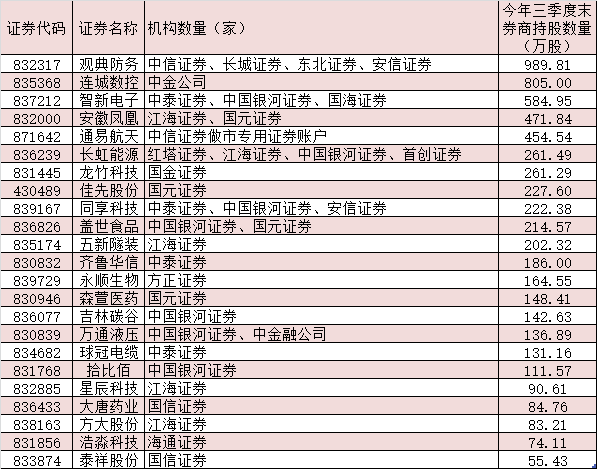 從券商持股數(shù)量來看,上述23家精選層公司股票中,券商今年三季度持股數(shù)量超100萬股的個股有18只,觀典防務(wù)本期券商持股數(shù)量居首,達到989.81萬股,連城數(shù)控、智新電子等2家公司股票在今年三季度券商持股數(shù)量也均超500萬股。