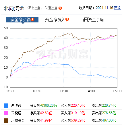 盡管股指表現(xiàn)不佳,但是北向資金已連續(xù)4個交易日凈買入。11月16日,北向資金凈買入41.99億元,其中,滬股通凈賣出0.64億元,深股通凈買入42.63億元。