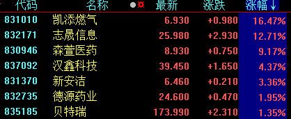 凱添燃?xì)庖?6.47%的漲幅位居首位,成交額突破1億元;緊隨其后的志晟信息、森萱醫(yī)藥,漲幅分別為12.71%和9.17%。