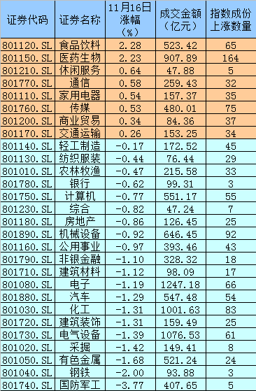 11月16日,A股三大指數(shù)延續(xù)震蕩走勢。截至收盤,上證指數(shù)跌0.33%,報3521.79點;深證成指跌0.15%,報14613.97點;創(chuàng)業(yè)板指跌0.24%,報3393.71點;滬深兩市合計成交額11136.86億元,連續(xù)第18個交易日突破1萬億元;總體來看,兩市個股普跌,3200只個股下跌。