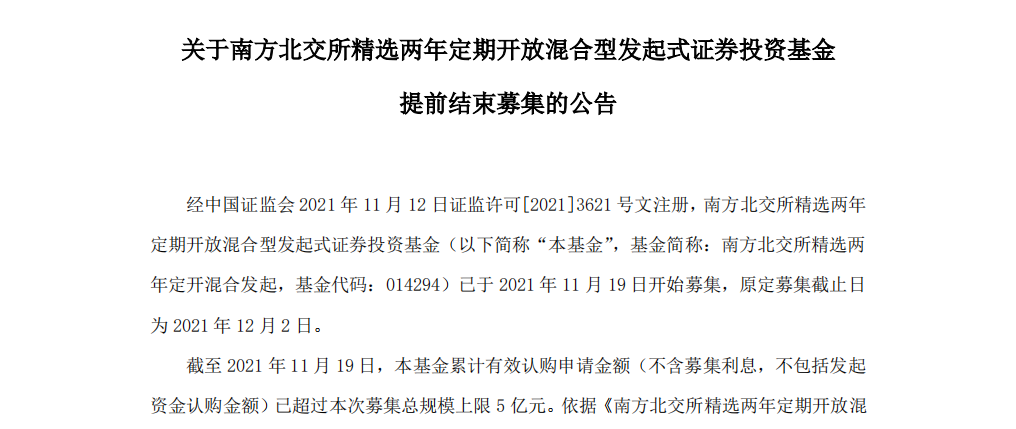 公告均稱,基金累計(jì)認(rèn)購申請金額已超過募集總規(guī)模上限5億元,決定提前結(jié)束募集,11月19日為基金最后認(rèn)購日。自11月20日起基金將不再接受投資者的認(rèn)購申請。基金管理人對2021年11月19日的有效認(rèn)購申請采用“末日比例確認(rèn)”的原則給予部分確認(rèn),未確認(rèn)部分的認(rèn)購款項(xiàng)將在募集期結(jié)束后退還給投資者。比例確認(rèn)的結(jié)果將另行公告。