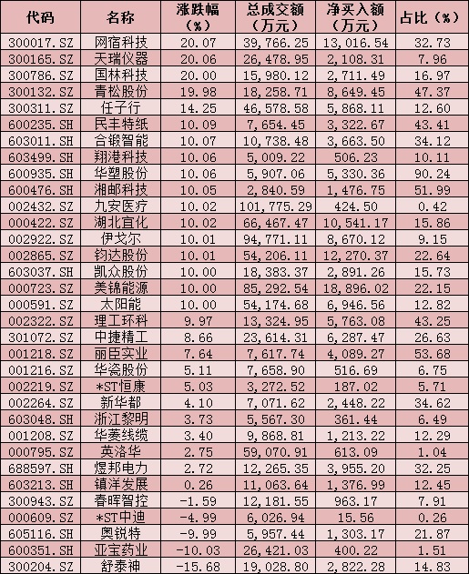 值得關(guān)注的是,網(wǎng)宿科技、天瑞儀器、國林科技等3只個股,周三均報收于“20厘米”漲停,勇登龍虎榜。