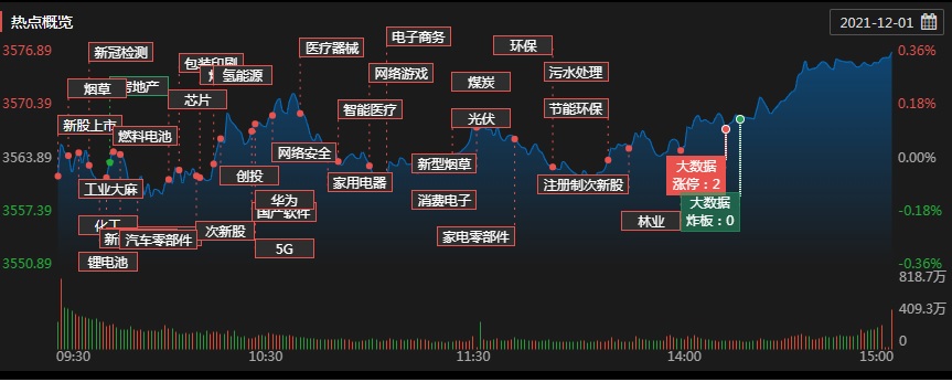 12月份的首個交易日,A股三大指數(shù)窄幅震蕩,漲跌不一。上證指數(shù)收盤漲0.36%,報3576.84點,走出了“開門紅”行情;深證成指微跌0.01%,報14794.25點;創(chuàng)業(yè)板指下跌0.64%,報3473.37點。滬深兩市合計成交額11464.9億元,兩市成交額連續(xù)第29個交易日突破1萬億元;總體來看,兩市個股普漲,超3200只個股上漲。其中,漲停個股達121只,跌停個股僅有5只。