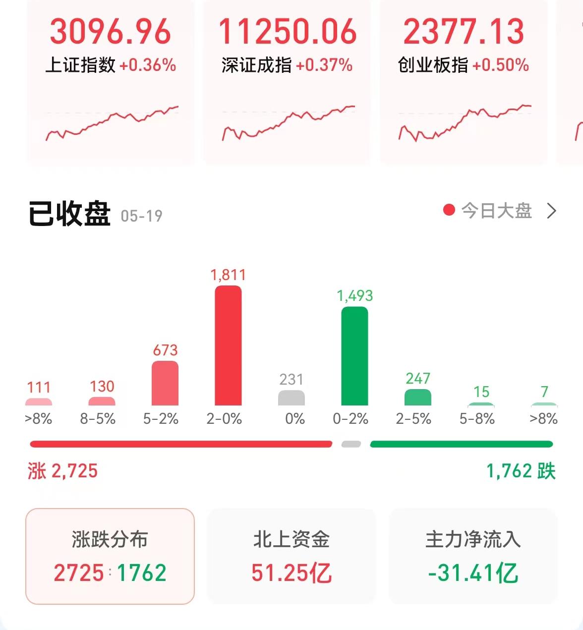 5月19日,三大股指低開高走,集體飄紅,截至收盤,上證指數(shù)漲0.36%報3096.96點,深證成指漲0.37%報11250.06點,創(chuàng)業(yè)板指漲0.5%報2377.13點;兩市合計成交8067.1億元,北向資金凈買入51.25億元。總體來看,兩市個股漲多跌少。
