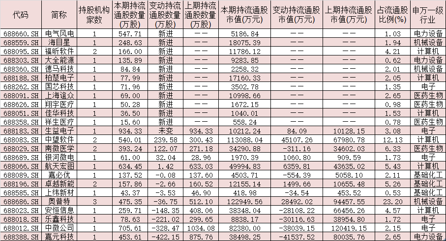 截至今年二季度末,上述163家科創(chuàng)板公司中,有24家公司前十大流通股股東名單中出現(xiàn)QFII身影,合計持股市值59.92億元。其中,11家公司股票今年二季度獲QFII新進(jìn)持有,電氣風(fēng)電、海目星、福昕軟件、大全能源等4家公司股票今年二季度QFII新進(jìn)持股數(shù)量均超百萬股。