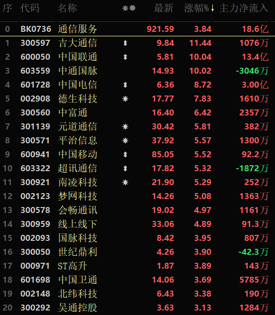 從早盤表現(xiàn)相對強(qiáng)勢的通信服務(wù)行業(yè)看,交易中的41只成分股中有40只上漲,其中,有2只封漲停板,另有10只個股漲幅超5%。資金方面,有18.6億元大單資金凈流入該行業(yè),居各行業(yè)第4位。