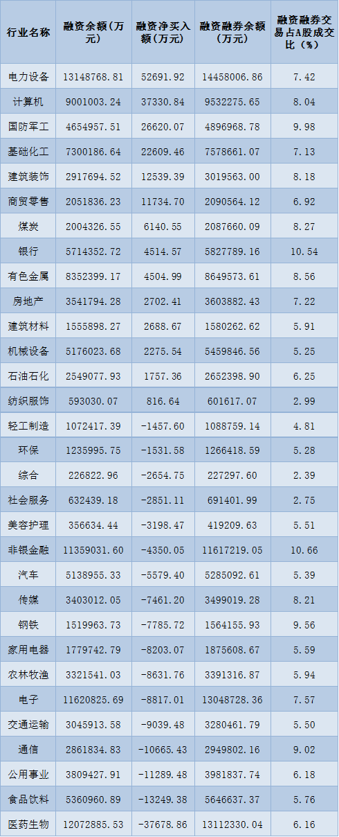 表:2月28日申萬一級行業(yè)兩融交易情況: