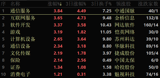 東方財富行業(yè)方面,截至3月1日11:30,86類行業(yè)中62類上漲,占比72.09%,其中,通信服務(wù)行業(yè)漲幅居首,達(dá)3.84%,此外,互聯(lián)網(wǎng)服務(wù)、軟件開發(fā)和游戲等行業(yè)漲幅也均超3%。下跌方面,光伏設(shè)備跌幅居首,達(dá)1.72%。
