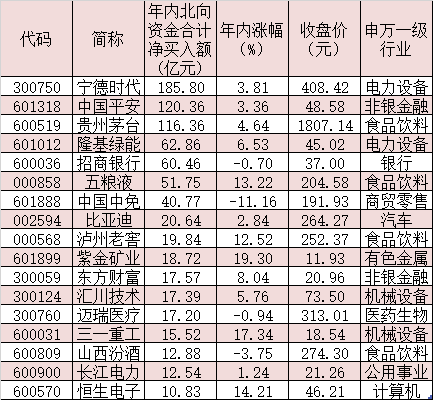 表:年內(nèi)受到10億元以上北向資金布局的個股
