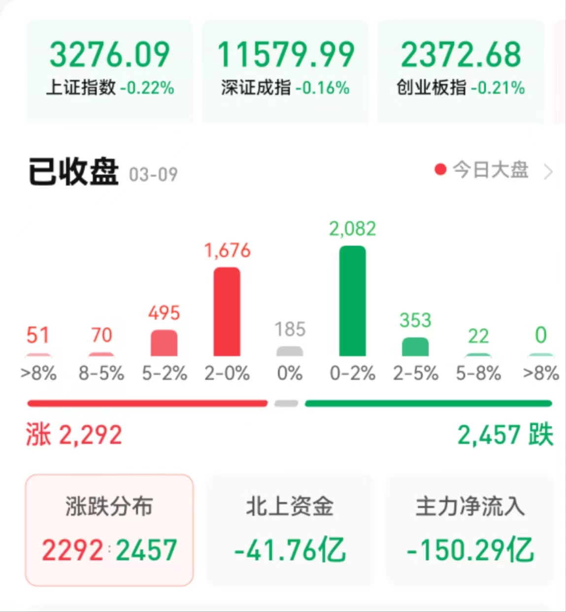 周四(3月9日),A股三大指數(shù)震蕩整理。截至收盤,上證指數(shù)跌0.22%報(bào)3276.09點(diǎn),深證成指跌0.16%報(bào)11579.99點(diǎn),創(chuàng)業(yè)板指跌0.21%報(bào)2372.68點(diǎn);兩市合計(jì)成交7566億元,北向資金凈賣出41.76億元??傮w上看,兩市個(gè)股跌多漲少。其中,漲停個(gè)股達(dá)35只,跌停2只。