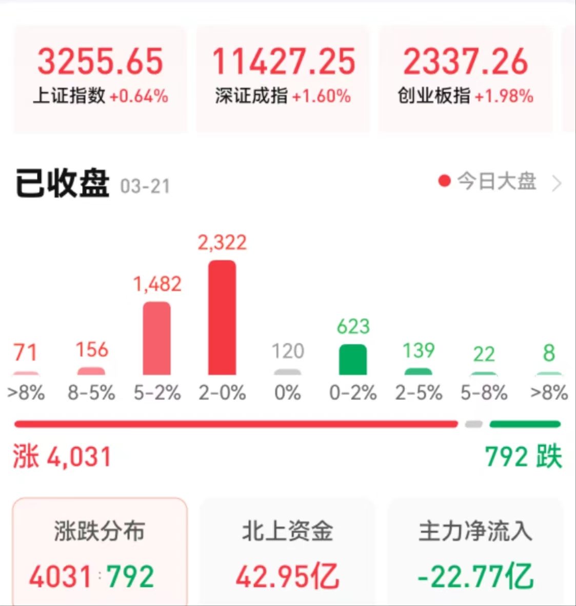 3月21日,A股市場(chǎng)震蕩上漲,三大股指全線反彈,創(chuàng)業(yè)板指漲幅近2%。值得關(guān)注的是,今日,北向資金凈買入超42億元,連續(xù)7個(gè)交易日實(shí)現(xiàn)凈買入。業(yè)內(nèi)人士普遍認(rèn)為,市場(chǎng)將延續(xù)弱勢(shì)震蕩格局。